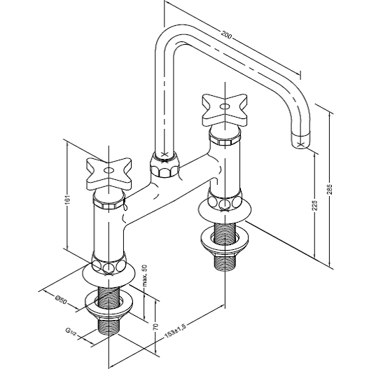 TONI Copenhagen Krydsgreb køkkenbatteri med 200 mm U-tud, svingbar og lodrette greb i messing.