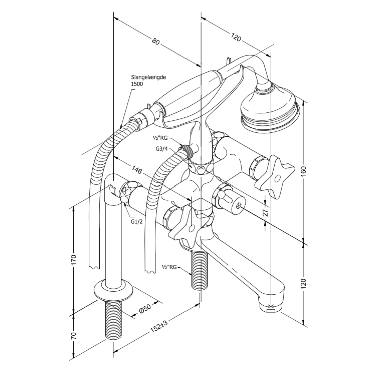 TONI Copenhagen Krydsgreb Kar- & brusebatteri på små standere med gaffelstykke og håndbruser i messing