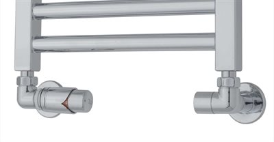 Dette TVS vinkelløbende  ventilsæt er med retur termostat, som bruges når håndklæderadiatoren monteres på ens central- / fjernvarmesystemet. Et vinkelløbende ventilsæt forudsætter, at der kommer rør ud fra væggen.