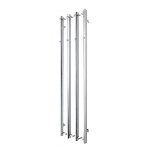 Afstand mellem lodrette rørsektioner: 76 mm  Antal kroge: 8 stk. ( 2 rækker med 4 stk ) Højde: 1400 mm  Bredde: 360 mm  En dekorativ, funktionel model. Lige linier og et design der passer ind de fleste steder. Udstyret med 8 kroge der gør det nemt at hænge håndklæderne op - selv for familiens mindste. Den er velegnet til det mellemstore badeværelse, hvor der er behov for supplement til gulvvarmen og ønske om en funktionel håndklæderadiator.