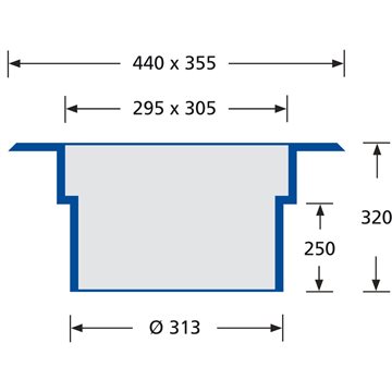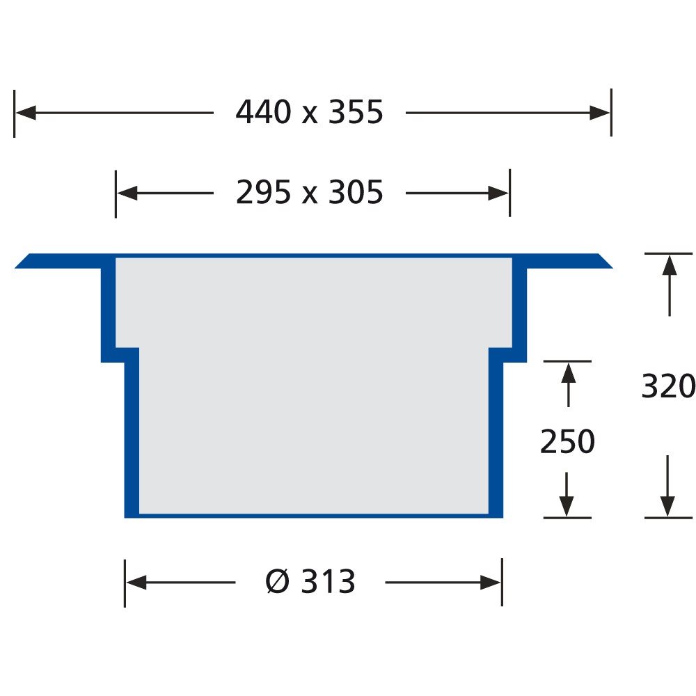 Flydende støbejerns rendestenskarm med rist og langt skørt. Dimension Ø 315 mm.