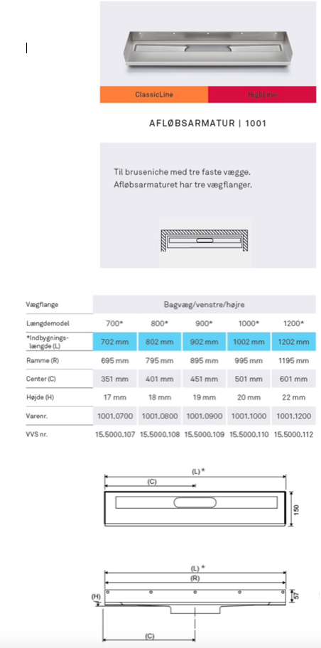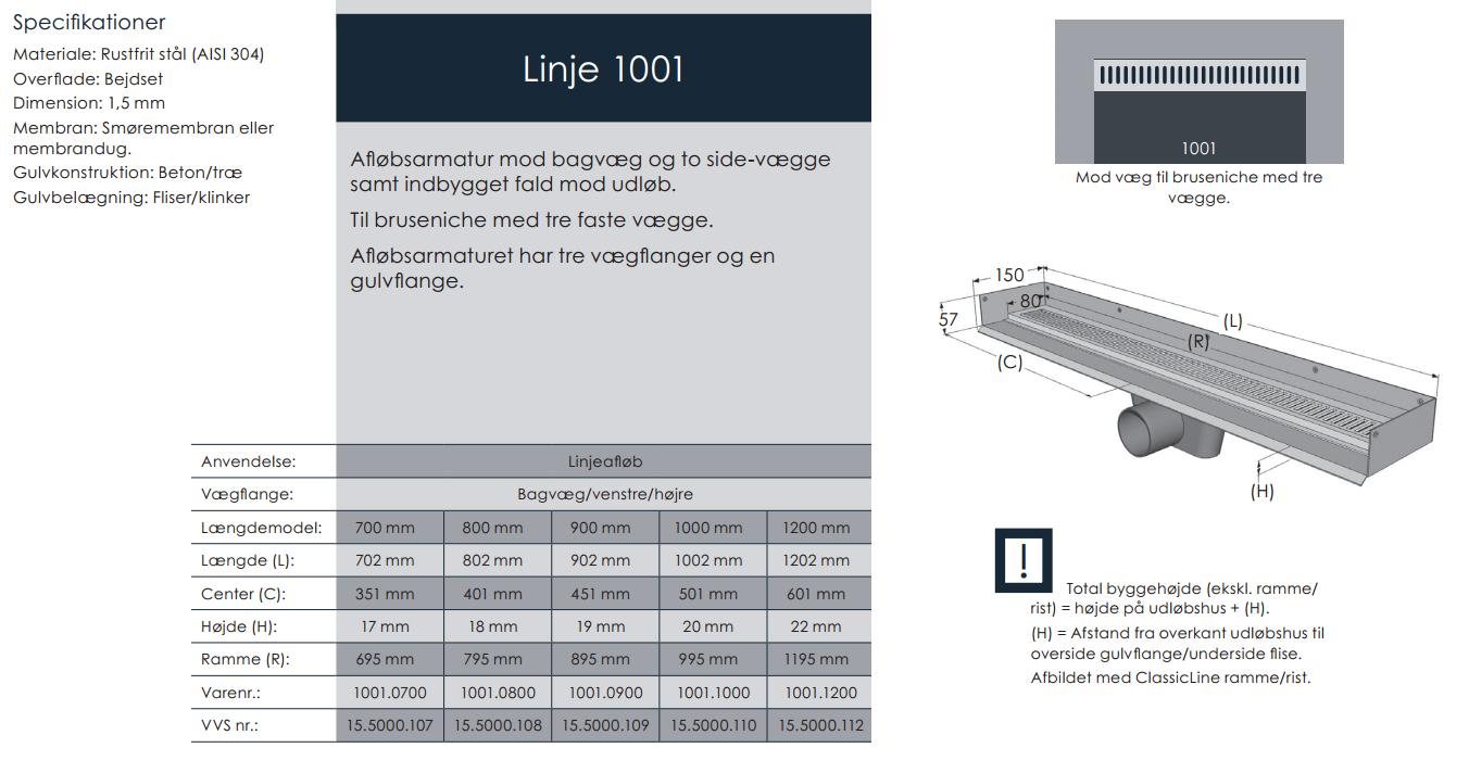 1001 Niche afløb til placering mod bagvæg og 2 faste sidevægge. 900 mm. Fås i flere længder