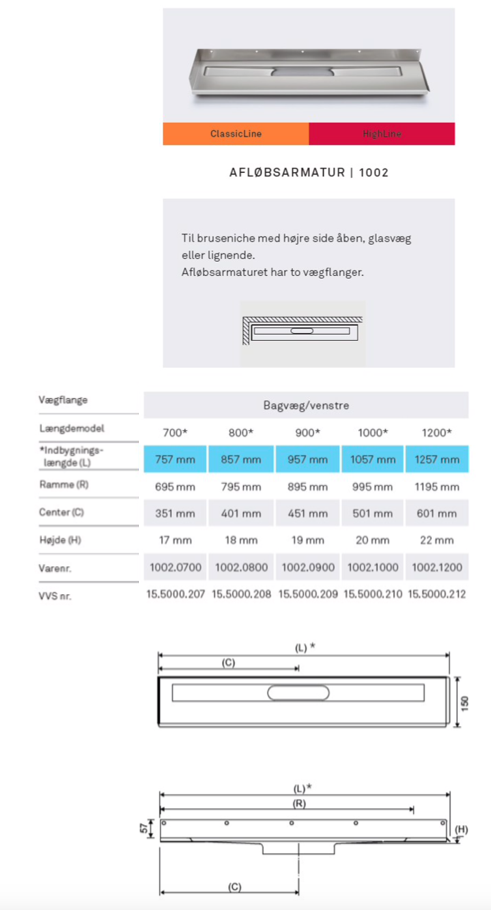 1002 Niche afløb til placering mod bagvæg og venstre sidevæg - højre side åben/glas 1000 mm.