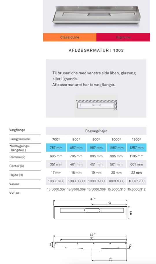 1003 Niche afløb til placering mod bagvæg og højre sidevæg - venstre side åben/glas. 1000 mm.