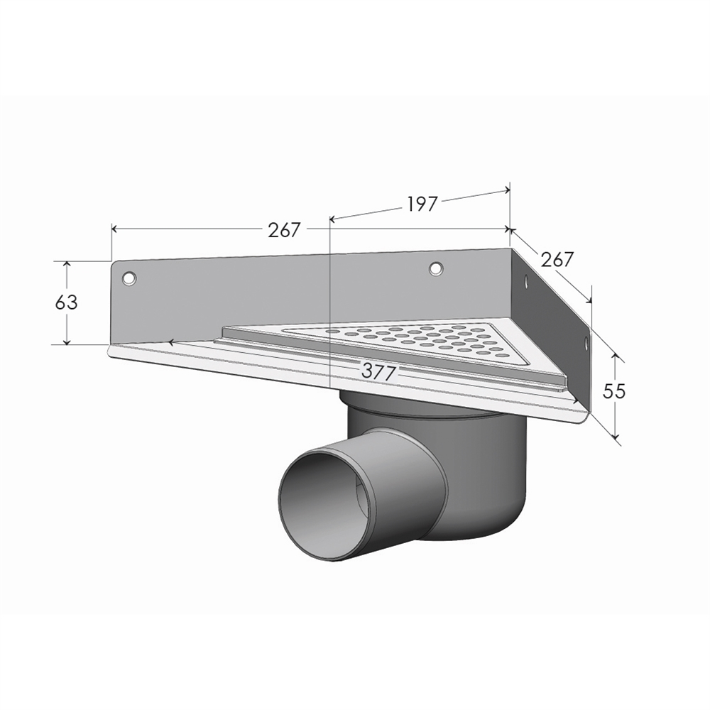 Afløbsarmatur til hjørneplacering. Med 2 vægflanger og 1 gulvflange til placering i hjørne.