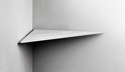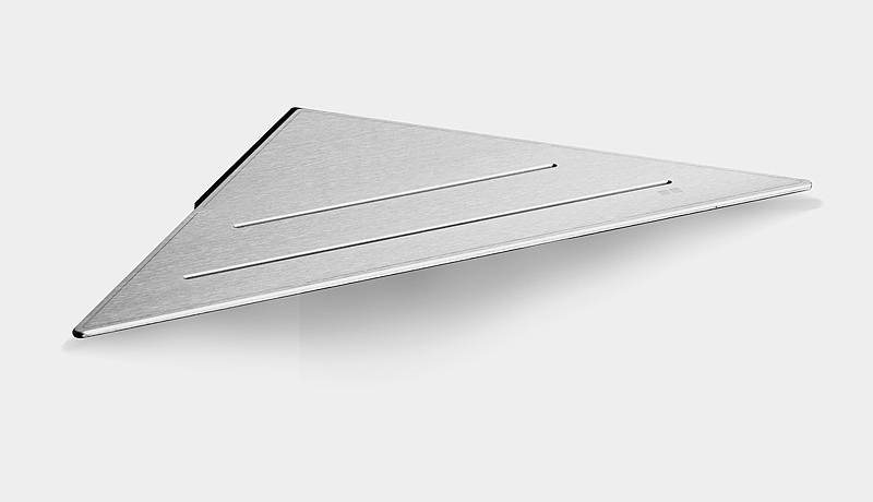 • Hylde i forstærket stålplade. Tynde riller leder vandet væk og en anti-slip barriere holder tingene på plads. Smart ophængsløsning gør, at hylden kan tilpasses hjørner som ikke er præcis 90 grader.