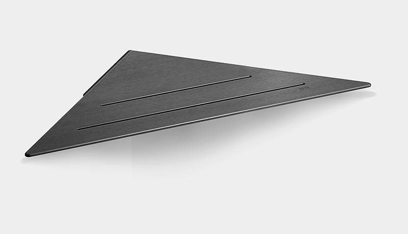 • Hylde i forstærket stålplade. Tynde riller leder vandet væk og en anti-slip barriere holder tingene på plads. Smart ophængsløsning gør, at hylden kan tilpasses hjørner som ikke er præcis 90 grader.