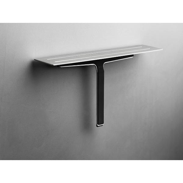 Sæbehylde med magnetisk ophæng til bruseskraberen. Hylden er produceret i forstærket stålplade med spor, der dræner vandet af pladen. Rundt i kanten er lasergraveret en tynd ”antislip” barriere, som hjælper med at shampoo og andre badprodukter ikke glider af hylden, når den er våd. Bruseskraberen består af to dele – et højkvalitets silikoneemne båret i en forstærket stålramme. Skraberen er monteret med silikone bumpere i enderne, hvilket beskytter fliser og andre overflader mod skrammer.