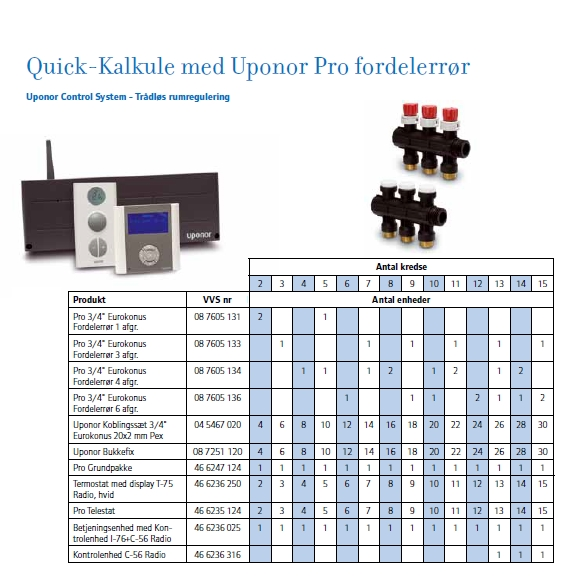 Uponor Pro 1 3/4 Eurokonus fordelerrør, c/c 50 mm, for gulvvarme med 3/4 Eurokonus til Wirsbo-pePEX Q&E , evalPEX eller Uponor MLCP-rør. Leveres parvis med fremløbs- og returfordelerrør. Indregulering af kredsene foretages på fremløbsfordelerrøret. De viste Håndhjul på returfordelerrøret kan erstattes af Uponor Pro telestat