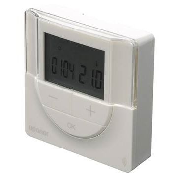 Programmerbar trådløs termostat med display, med integreret måling af relativ fugtighed. Anvendes med Uponor Smatrix kontrolenhed X-165 6X, Til brug o gulvvarmesystemer, som også anvendes til køling. Indeholder batterier, montagebeslag. Kan anvendes med ekstern føler: max., min. gulvtemperatur, fjern- eller udendørsføler. 6 forudindstillede programmer samt et frit program.