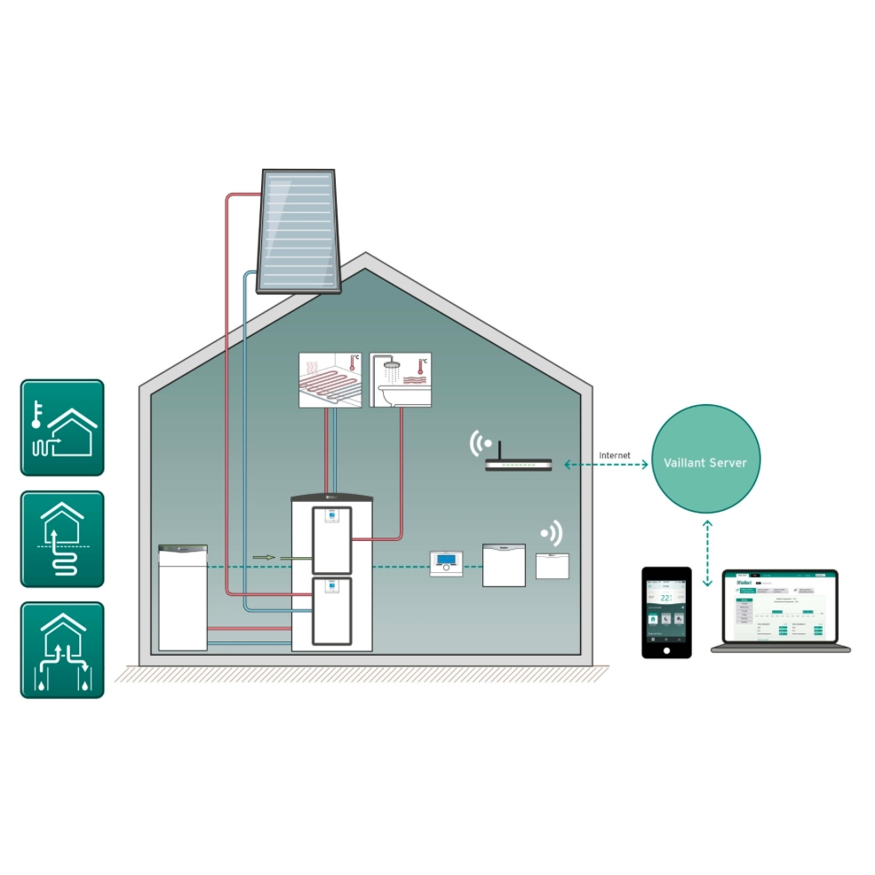 Med Vaillants flexoCOMPACT exclusiv varmepumpe, som har integreret 171 l. varmtvandsbeholder, har du alle muligheder for at udnytte jordens eller luftens gratis energi til opvarmning af din bolig. Varmepumpen kan tilpasses ethvert behov for opvarmning og varmtvandsproduktion. flexoCOMPACT exclusive er opbygget omkring et universalt koncept, idet samme væske/vand varmepumpe kan anvendes enten som jordvarme- eller luft til vand varmpumpe - ved jordvarmeanlæg via jordslanger eller en boring, hvor energien overførest til varmepumpen inde i huset - ved luft til vand varmepumpeanlæg, hvor udeluftens energi overføres til varmepumpen via en udendørsenhed. Udendørsenhed medfølger ikke.