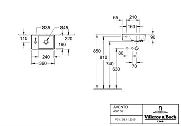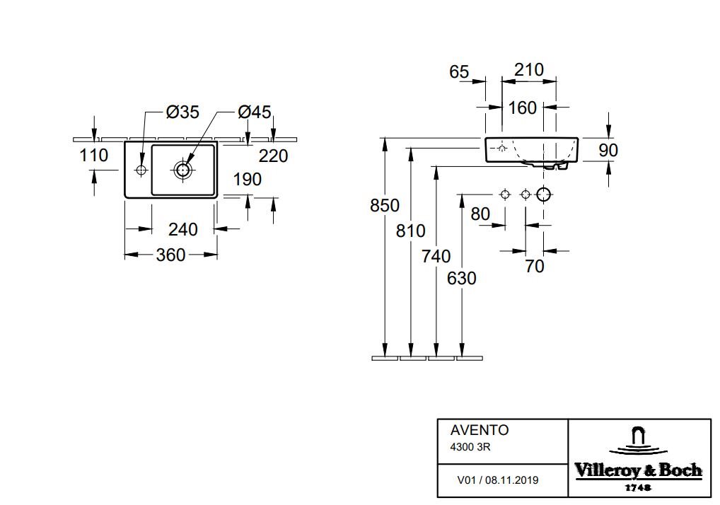 Villeroy & Boch AVENTO håndvask 360 x 220mm med hanehul til venstre til vægmontering.