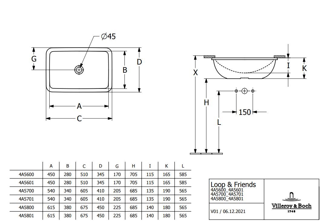 Villeroy & Boch Loop & Friends Underlimningshåndvask, 540 x 340 x 185 mm, Hvid Alpin, med overløbshul