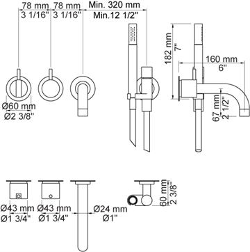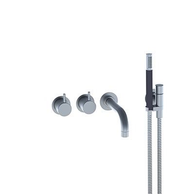 Vola 2411C-071 Kar-/Bruserbatteri. Med fast tud, håndbruser og rosetter.