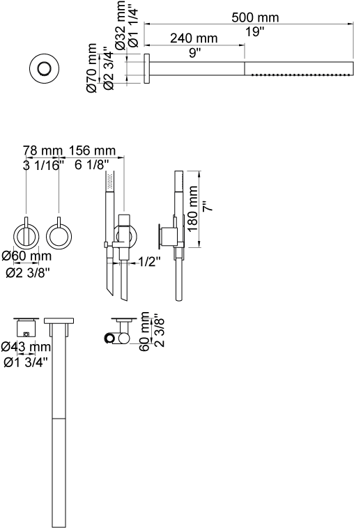 Vola 2471-081ST med hoved-og håndbruser - I Børstet krom