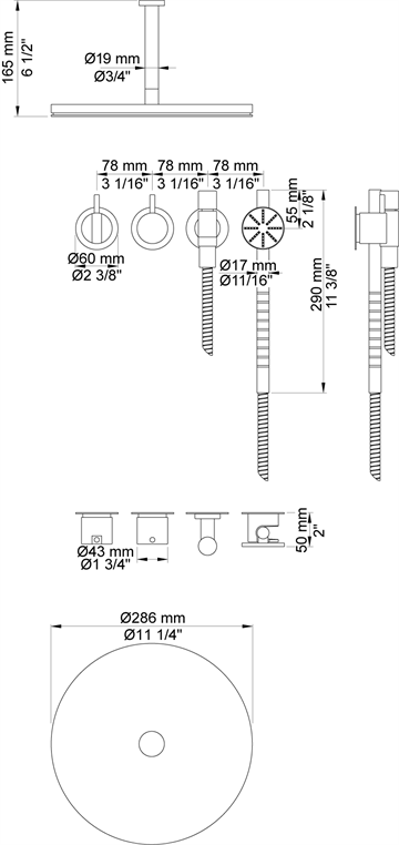 2471S-061AAP = Greb NR21, omskiftergreb NR24G, håndbruser og holder for håndbruser med kontraventil 070S, loftmonteret hovedbruser 060A, 4 stk. 60 mm dækrosetter 001, 2001. Vola T60 Håndbrusesættet består af følgende: