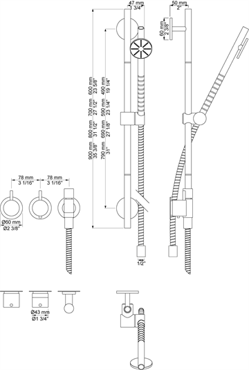 ¾" termostatblander med håndbruser og bruserstang.