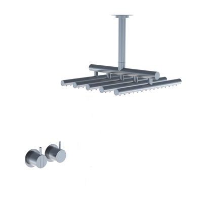Vola 5251A er en komplet termostatbrusebatteri til indbygning løsning med runde dækrosetter som leveres med.: