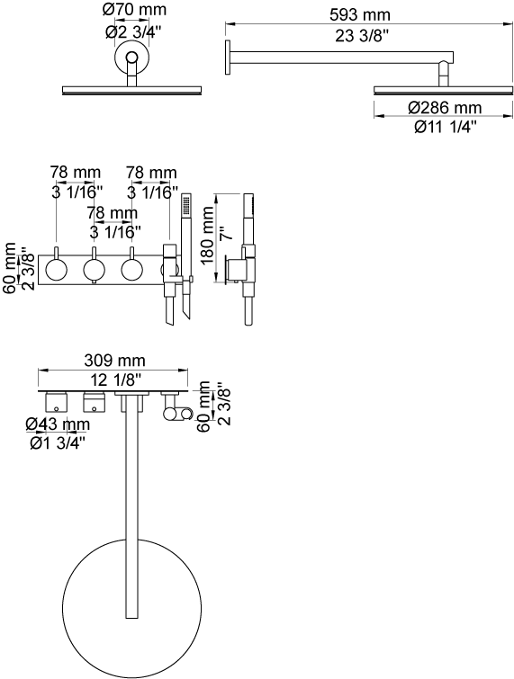 Vola 5471R-061 komplet Brusearmatur med stor hovedbruser Ø286mm samt smart håndbruser