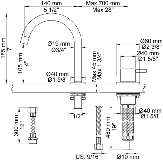 Vola 590G vandhanen er af messing, enkelte dele af rustfri stål (afhængig af den valgte overflade), og de særligt udsatte dele i armaturet er fremstillet i afzinkningsfri messing, der sikrer mod tæring af materialet. Delene slibes og poleres, og resultatet er et slutprodukt af usædvanlig høj kvalitet med en meget flot finish. Armaturet leveres med 10 mm fleksible tilslutningsslanger.