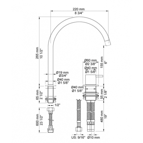 Vola 590H håndvaskbatteri - 265 mm høj - Krom
