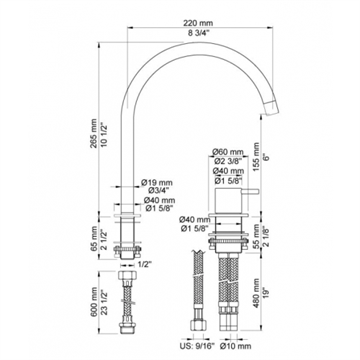 Vola 590H håndvaskbatteri - 265 mm høj - Børstet krom
