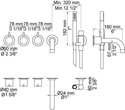 Vola 811C-071 karbatteri er en To-grebsblander med fast tud og håndbruser, fremspringet på tuden er 160 mm. Sættet er komplet og består af: