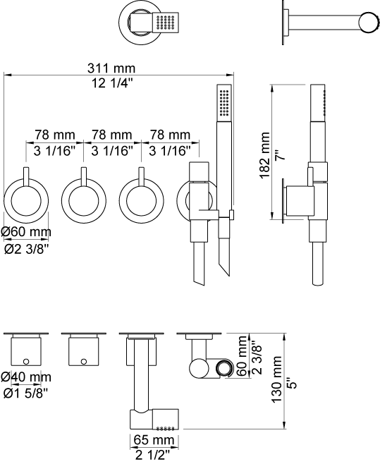 Vola batteri med hånd-og hovedbrus - flere variant - 871-081D i Børstet krom (dobbelt hovedbruser)