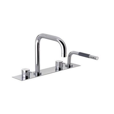 Vola BK10 er en et-grebsblander med dobbelt svingbar tud for karfyldning samt et-grebsblander med håndbruser. Komplet med justerbar monteringsramme og vandopsamlingsbox.