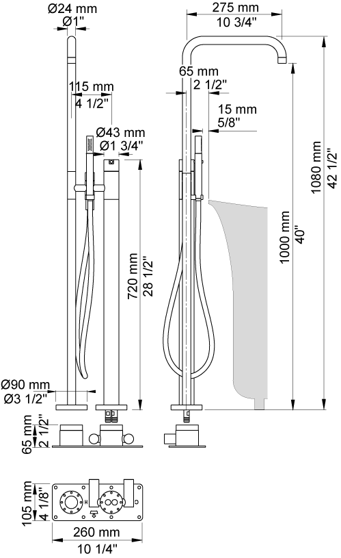 Armatur til fritstående badekar, højde 1080 mm.