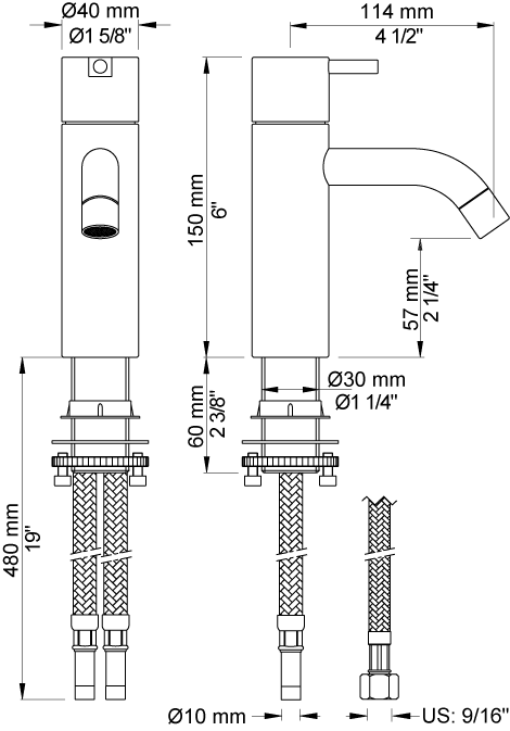 Vola HV1+30 er forhøjet med 3 cm i forhold til den oprindelige HV1. Fordelene er mere plads til hænderne. Vola HV1 vandhanens total højde er 150 mm og der er 57 mm fra udløbstud til bord og den leveres komplet med: