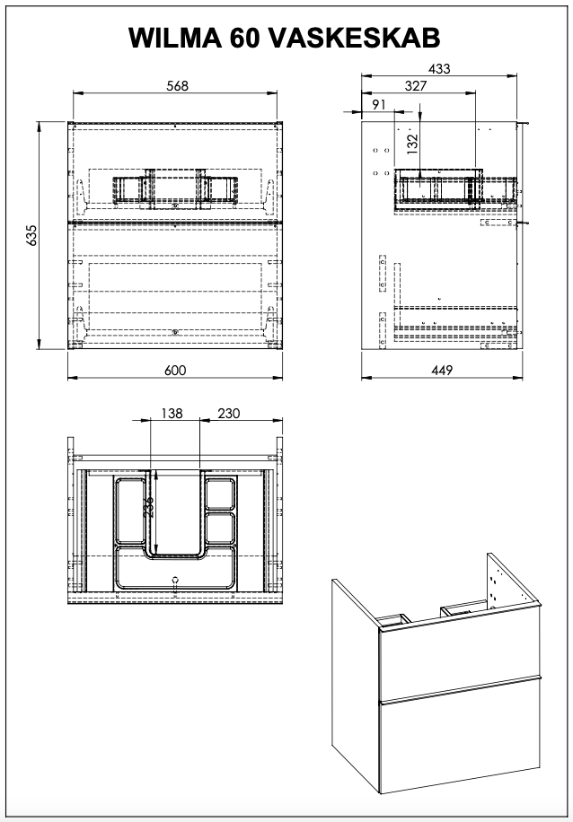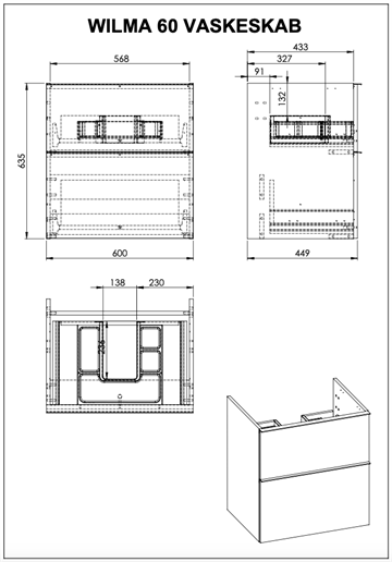 Møblet er forberedt for afløb i væg og i gulv, da der er 41mm fra bagkant af skuffe til væg