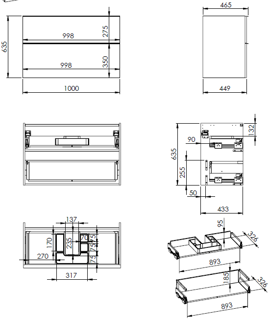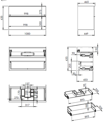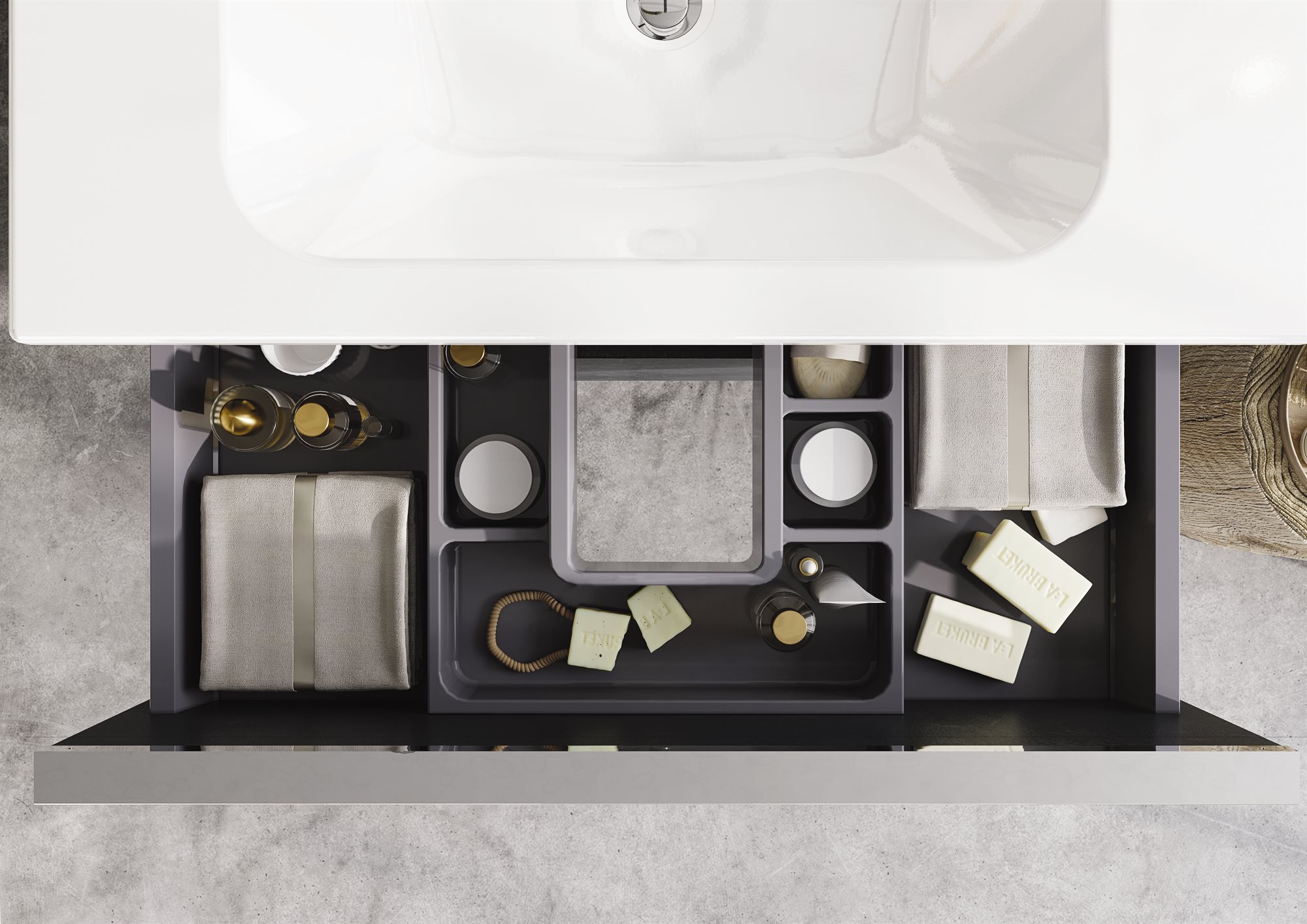 Øverste skuffe er inkl. praktisk ruminddeler og udskæring til afløb.