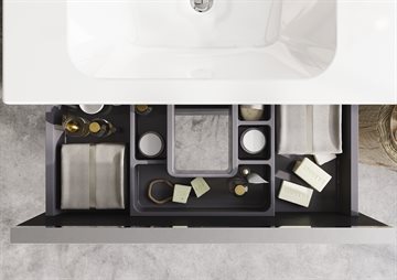 Møbelpakken har 2 skuffer som begge er med Soft Close, der sikrer en blød og lydløs lukning. Takket være det fulde udtræk af skufferne får du nem og hurtig adgang til alle dine ejendele. En praktisk ruminddeling i den øverste skuffe holder orden i badmøblet. Den nederste skuffe har en praktisk højde – den er lidt højere end den øverste, hvilket gør den ideel til placering af høje beholdere såsom rengøringsmidler, hårlak og shampoo.
